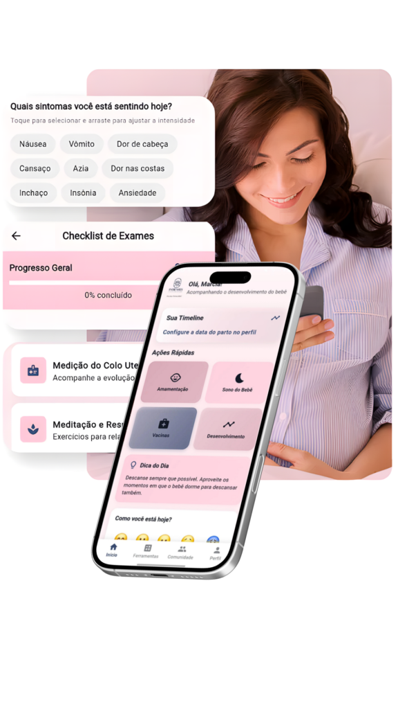 Assim que você acessa o app pela primeira vez, você escolha sua fase e ele se ajusta ao seu momento, mostrando: